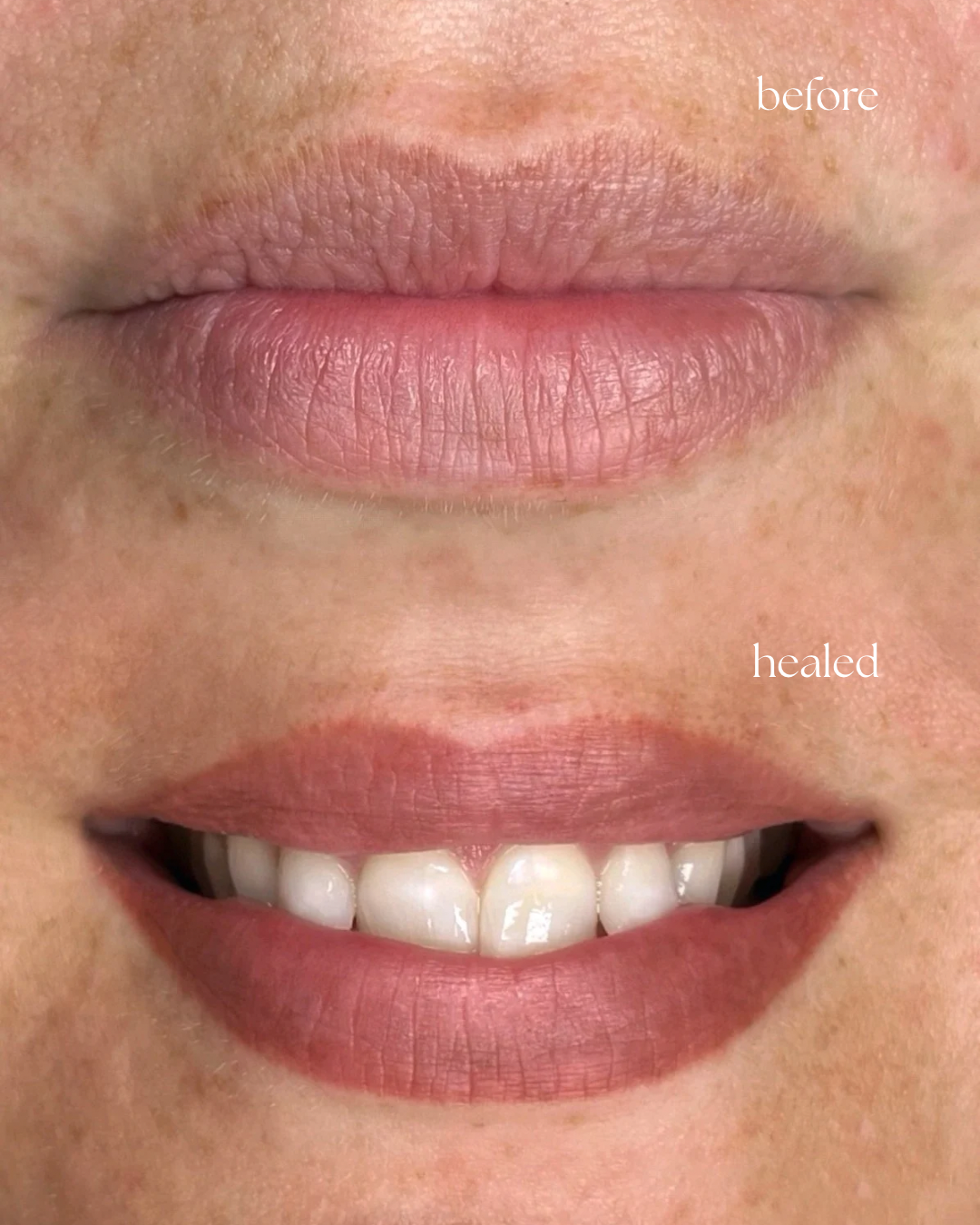 • Immediately after your PMU treatment, colours will appear more vibrant and deeper than the healed result. Mild swelling or redness is normal and usually subsides within 24 hours. Healing times vary depending on whether you have a brow or lip treatment, so it’s important to plan your procedure with a few days for initial healing in mind.